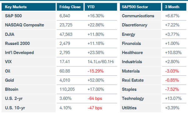 Overseas, the Bank of Japan kept rates unchanged but delivered its strongest signal yet that a hike was possible soon. Inflation accelerated to 2.8% in October, well above the central bank’s 2% target. The European Central Bank also left rates unchanged and offered no clues about future moves. Economic growth has remained steady in the Eurozone despite trade turbulence while inflation hovered near the bank’s goal. The Bank of Canada cut rates by 25 basis points, citing a weakening economy as the impact of U.S. tariffs is becoming more evident. Finally, China’s manufacturing activity contracted more than expected last month while services stayed in expansion territory.